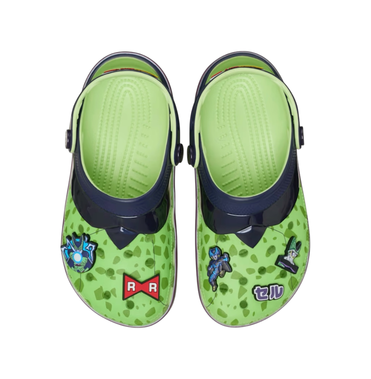 The Dragon Ball Z x Classic Clog Kids 'Cell' pays homage to the anime series' powerful villain. The clog is built with lightweight Croslite foam and showcases a colorful finish that reflects Cell's appearance, highlighted by a light green foundation with tonal speckles. High-shine navy accents cover the molded collar and pivoting heel strap, featuring an embossed Dragon Ball Z logo. Accompanying Jibbitz charms include Cell's various forms and a Red Ribbon Army charm.